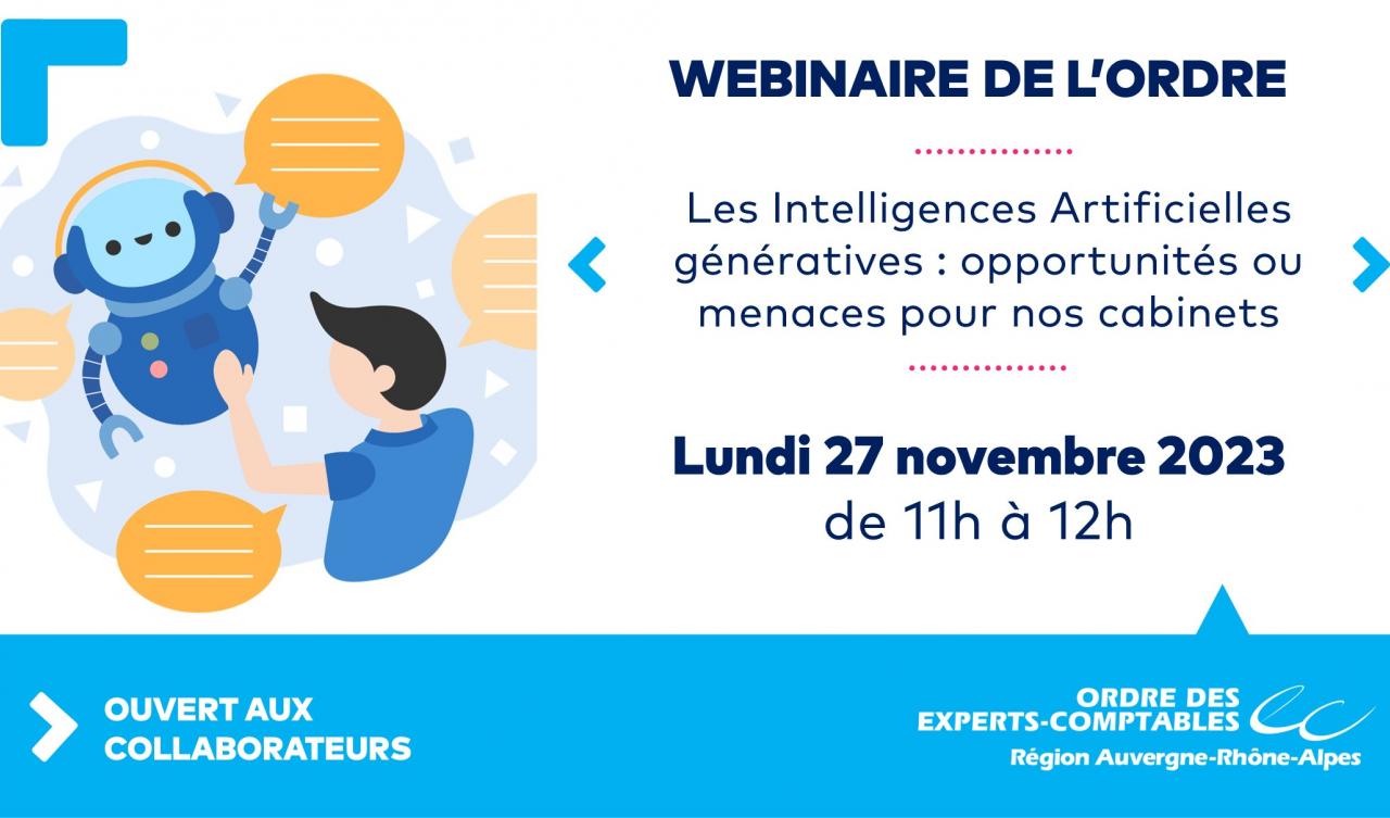 Visio - Les Intelligences Artificielles génératives : opportunités ou menaces pour nos cabinetsL'Ordre des Experts-Comptables Auvergne-Rhône-Alpes vous invite à participer à son webinaire "Les Intelligences Artificielles génératives, opportunités ou menaces pour nos cabinets".Le 27 novembre 2023 de 11h à 12hWebinaireFrance