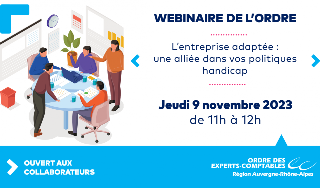 Visio - L’entreprise adaptée : une alliée dans vos politiques handicapL'Ordre des Experts-Comptables Auvergne-Rhône-Alpes, l’Agefiph, la DREETS et le Medef Auvergne-Rhône-Alpes vous invitent à participer à leur webinaire « L’entreprise adaptée : une alliée dans vos politiques handicap ».Le 9 novembre 2023 de 11h à 12h