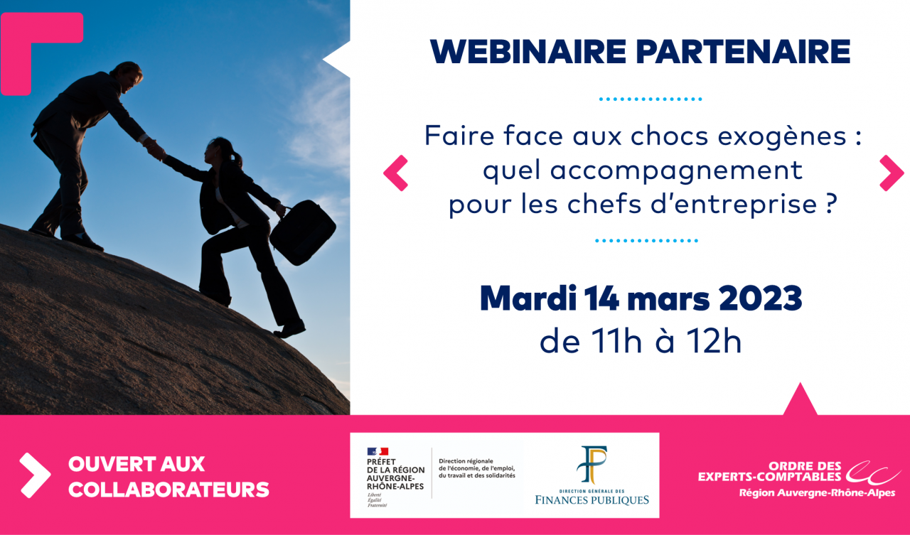 Visio - Faire face aux chocs exogènes : quel accompagnement pour les chefs d’entreprise ?L'Ordre des Experts-Comptables Auvergne-Rhône-Alpes et son partenaire la DREETS* Auvergne Rhône-Alpes vous invitent à participer à leur webinaire sur le thème "Faire face aux chocs exogènes : quel accompagnement pour les chefs d’entreprise ?", le mardi 14 mars 2023 de 11h à 12h.
