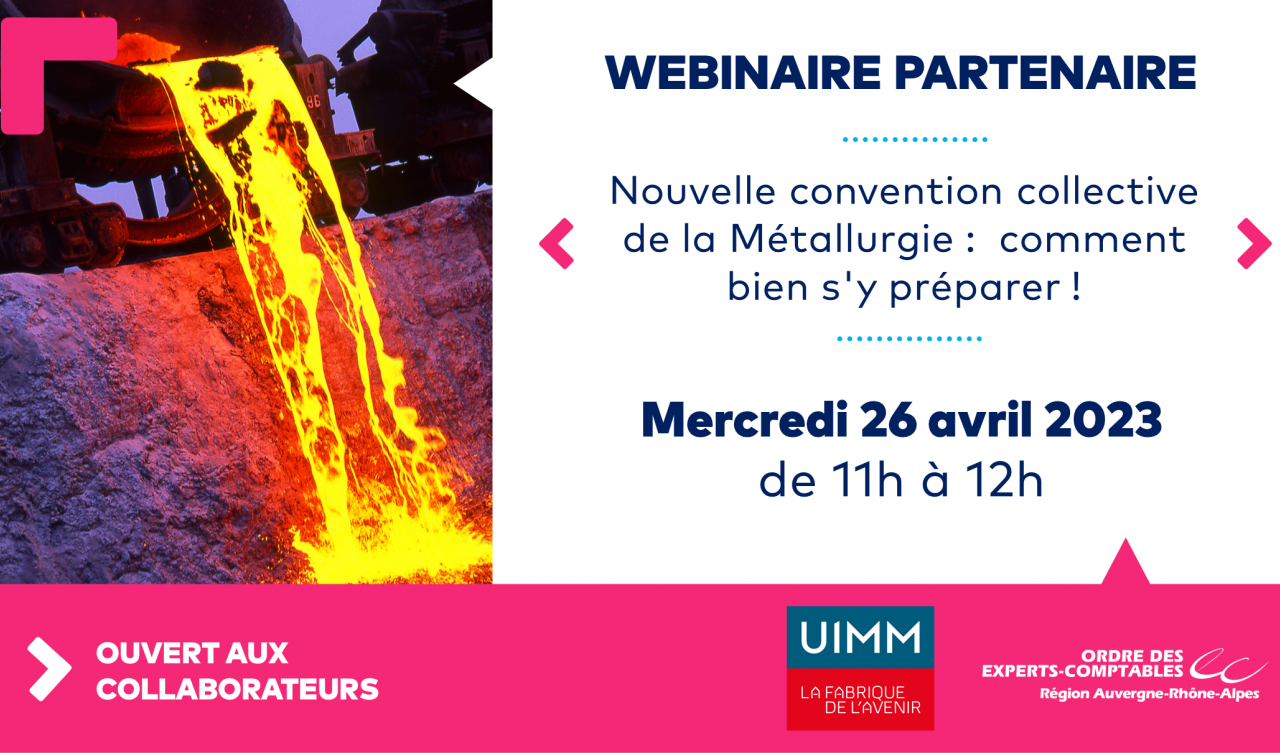 Nouvelle convention collective de la Métallurgie : comment bien s'y préparer !L'Ordre des Experts-Comptables Auvergne-Rhône-Alpes et l'Union des Industries et Métiers de la Métallurgie vous invitent à participer à leur webinaire sur le thème : "Nouvelle convention collective de la Métallurgie : comment bien s'y préparer !", le mercredi 26 avril 2023, de 11h à 12h.